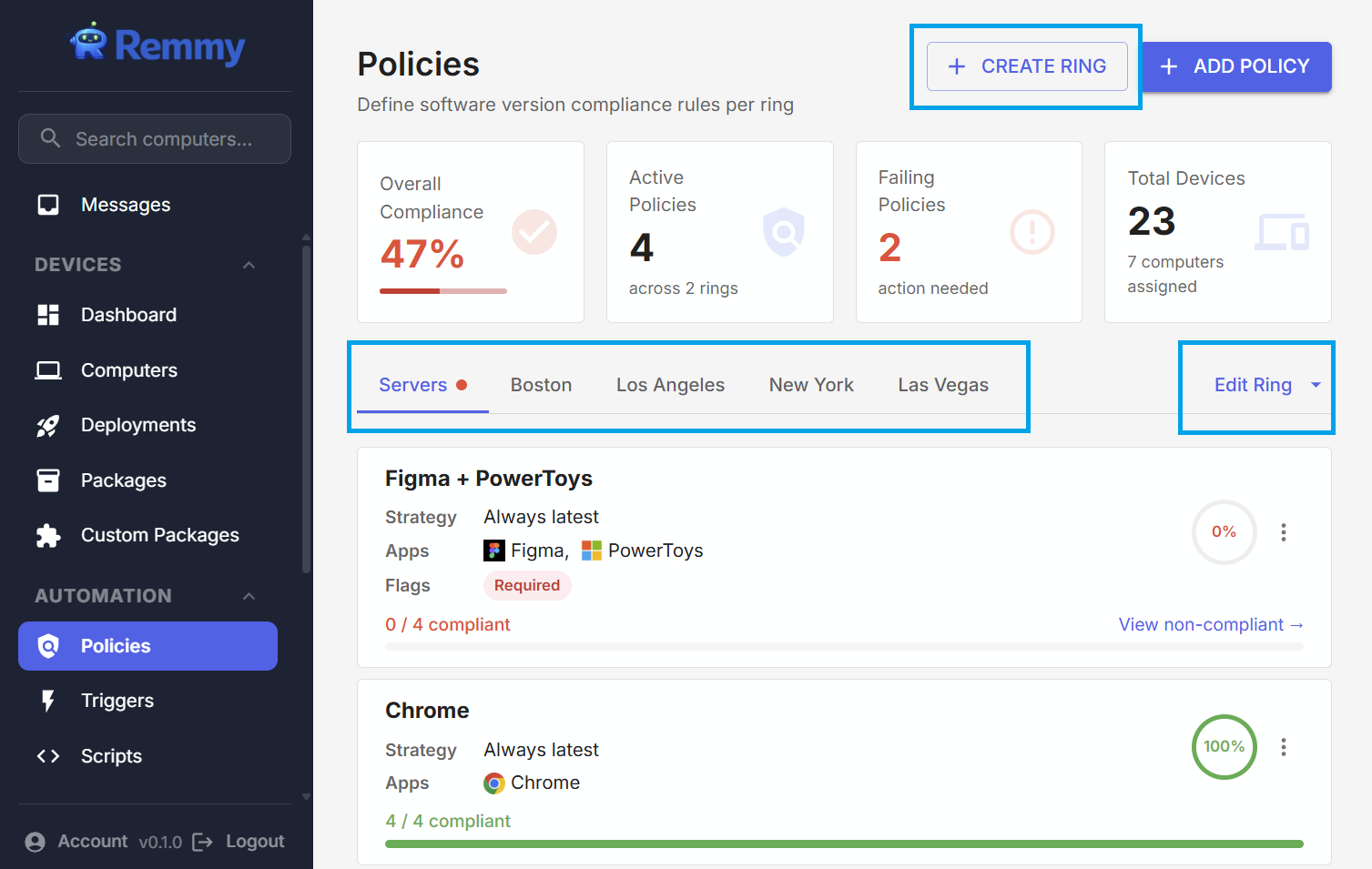 Rings are managed from the Policies page, where they appear as tabs across the top. Each tab shows the policies configured for that ring. When a computer is assigned to a ring, it will be evaluated against the policies in the ring.