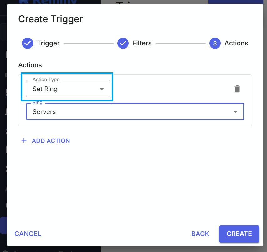 Triggers Create a trigger with a Set Ring action to automatically move computers between rings based on events. For example, a user could move a computer to a "Needs Attention" ring when it comes online after being offline, or move newly registered computers to a specific ring based on filter criteria.