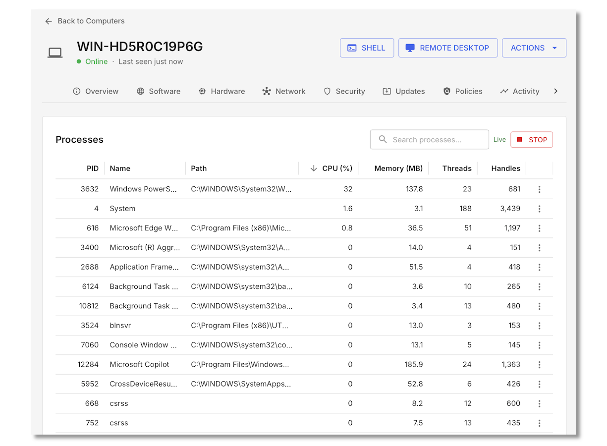 The remote process manager enables users to see a real-time stream of all the processes running on a managed computer. The data is streamed in real-time from the Remmy agent, making the data as real-time as sitting in front of the computer.