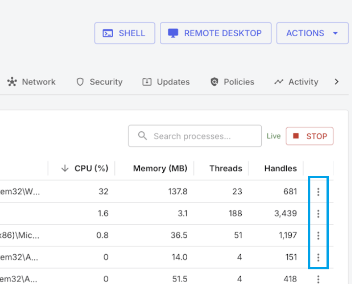 Users can end a process by clicking the three-dot menu in the Actions column on a process, and then select End Task. This immediately force-kills the process on the remote computer.