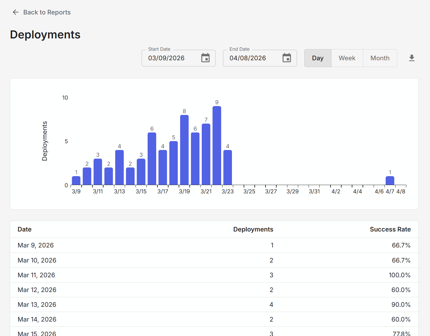 The Deployment report enables sysadmins to see a count of all deployments, and the associated success rate of deployments, over a set period of time. Users can adjust the date range, and how it is grouped (days, weeks, months). The report can be adjusted to show a stacked bar for success rate, and optionally downloaded as a CSV.